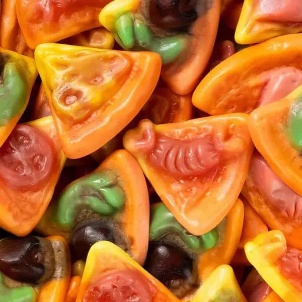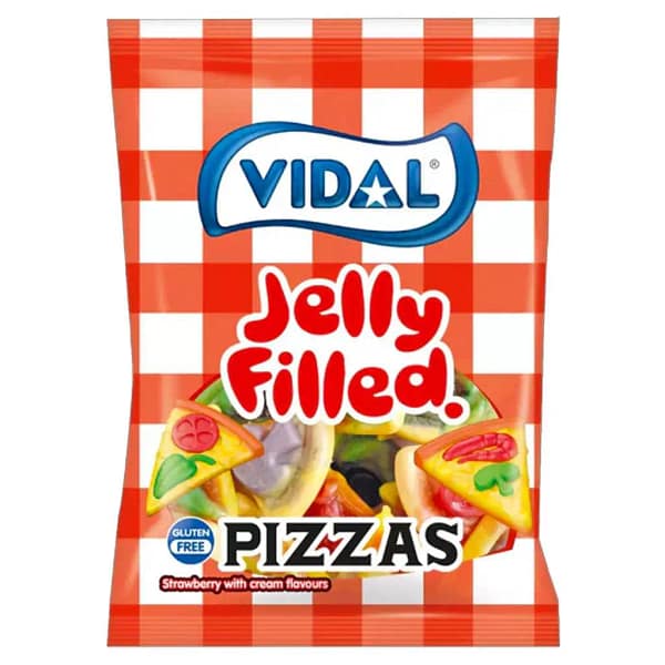 Vidal Jelly Filled Pizzas are attractively packaged pizza slice shaped sweets filled with fruit flavored jelly. Made in Spain.