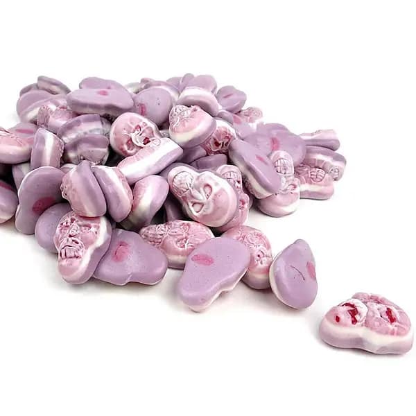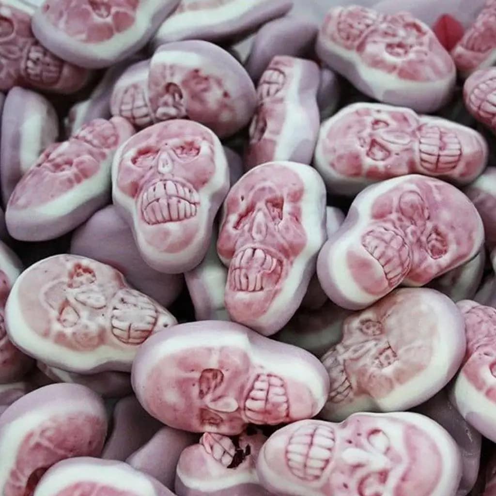 Fruit flavoured jelly filled sweets in the shape of a skull, perfect for Halloween treats. 1kg.
