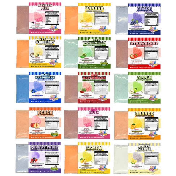 10 Grams of Flossine (concentrated) fairy floss colouring and flavouring for each flavour.