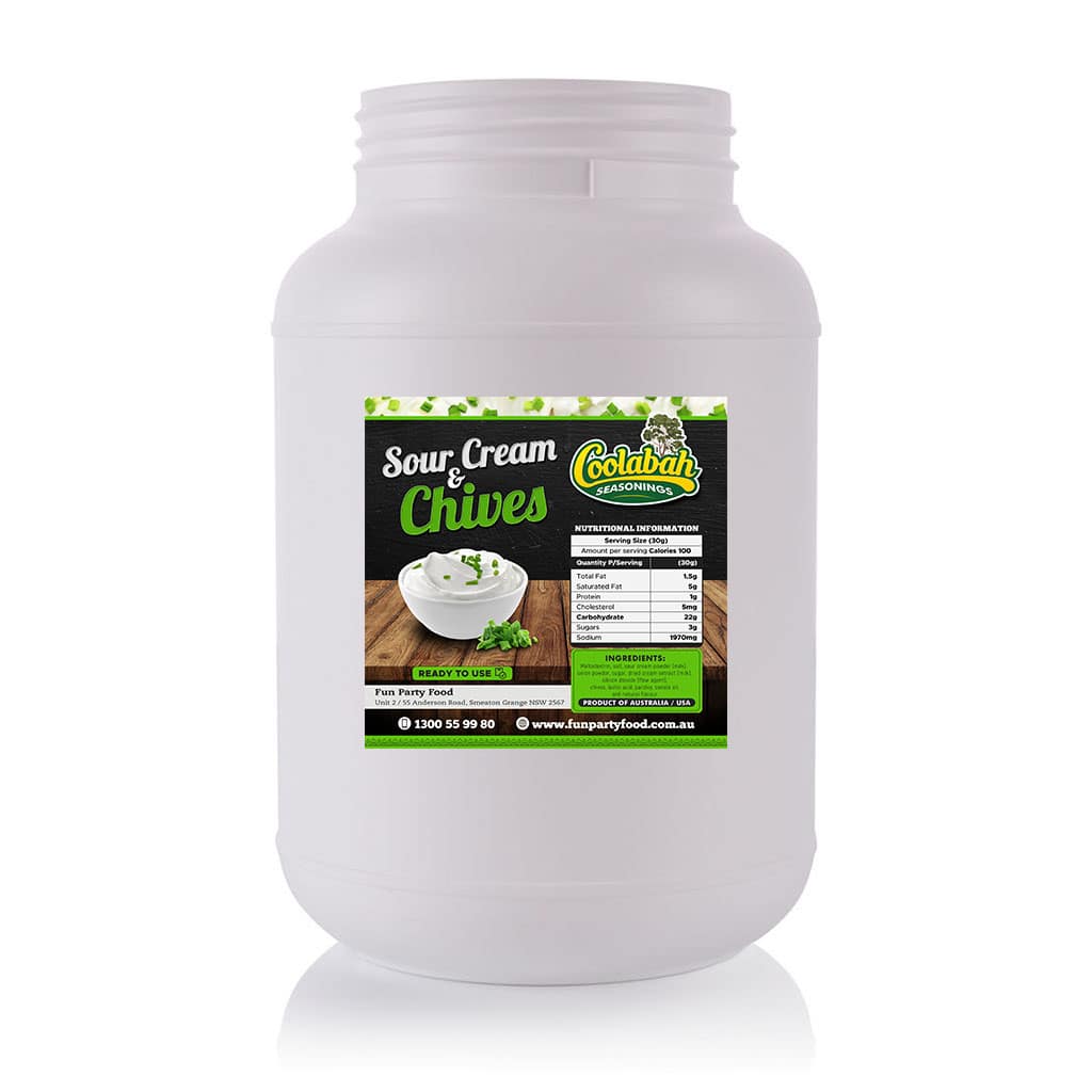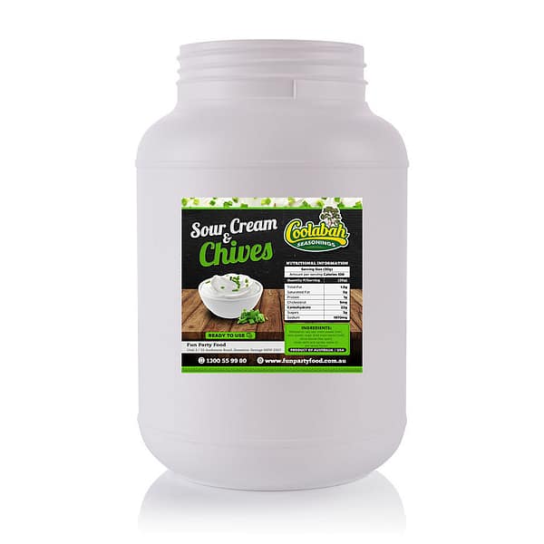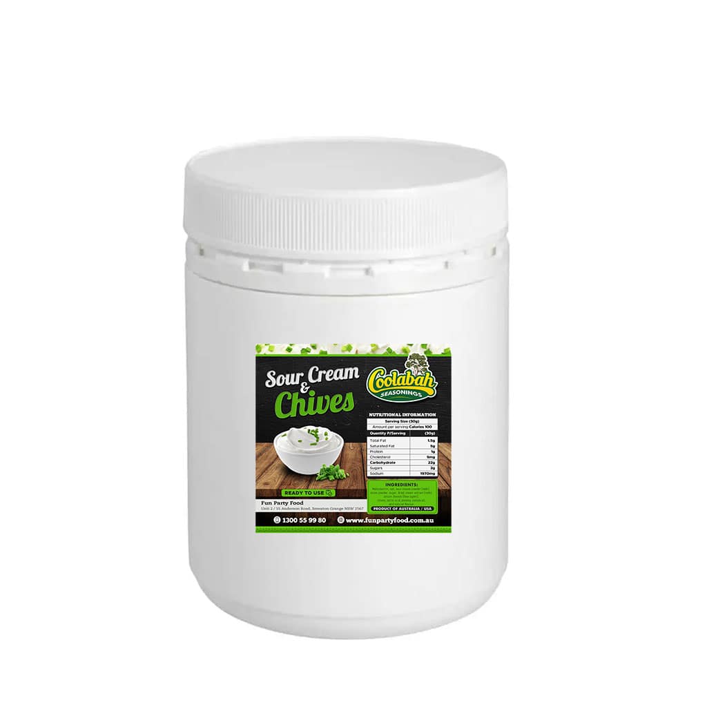 Sour Cream & Chives Seasoning (Gluten Free) is a fine, free-flowing popcorn seasoning blend, creamy white in colour with visible green herb particulates. It features a well-balanced sour cream and chives flavour and aroma profile, offering a rich, tangy taste with a savoury herb finish.