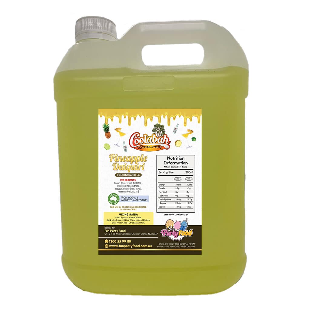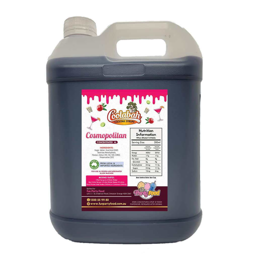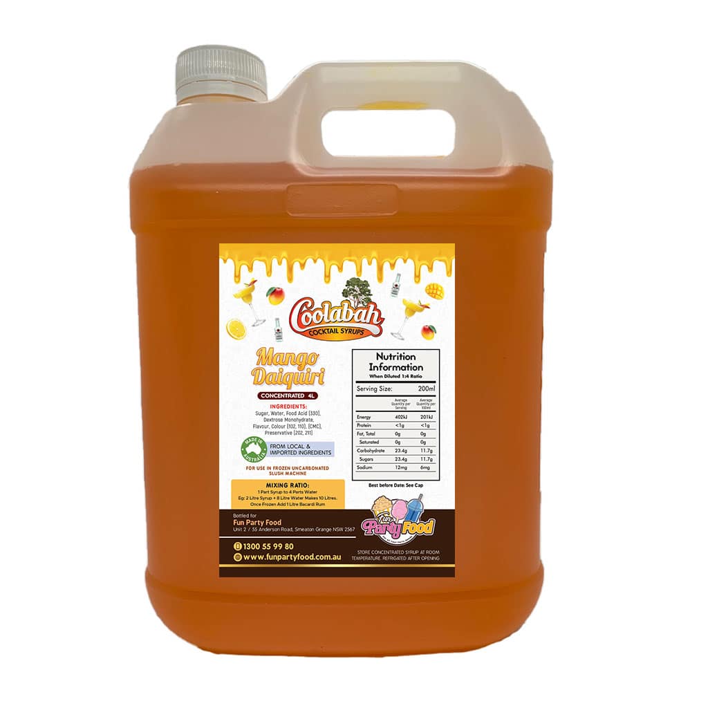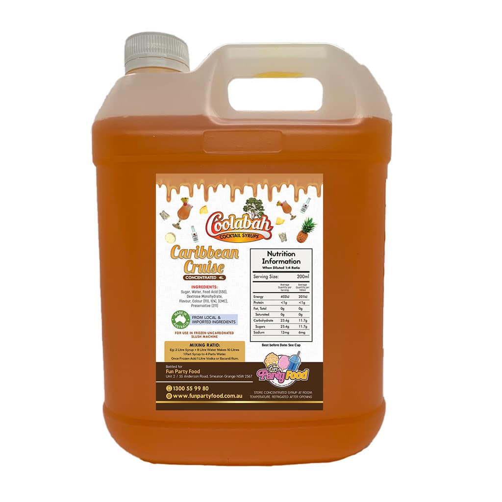 All our Syrups are made using 100% Australian sugar, and we have an extensive range of available with mouth watering cocktail delights like Fruit Tingle, Pina Colada, Margarita, Strawberry Daiquiri, Bahama Mama, Caribbean Cruise, Cosmopolitan, Coyote Ugly, Hurricane Lemon Lime & Bitters, Mango Daiquiri, Midori Illusion, Mojito, Mudslide, Sex On the Beach, Tequila Sunrise, Watermelon Daiquiri.